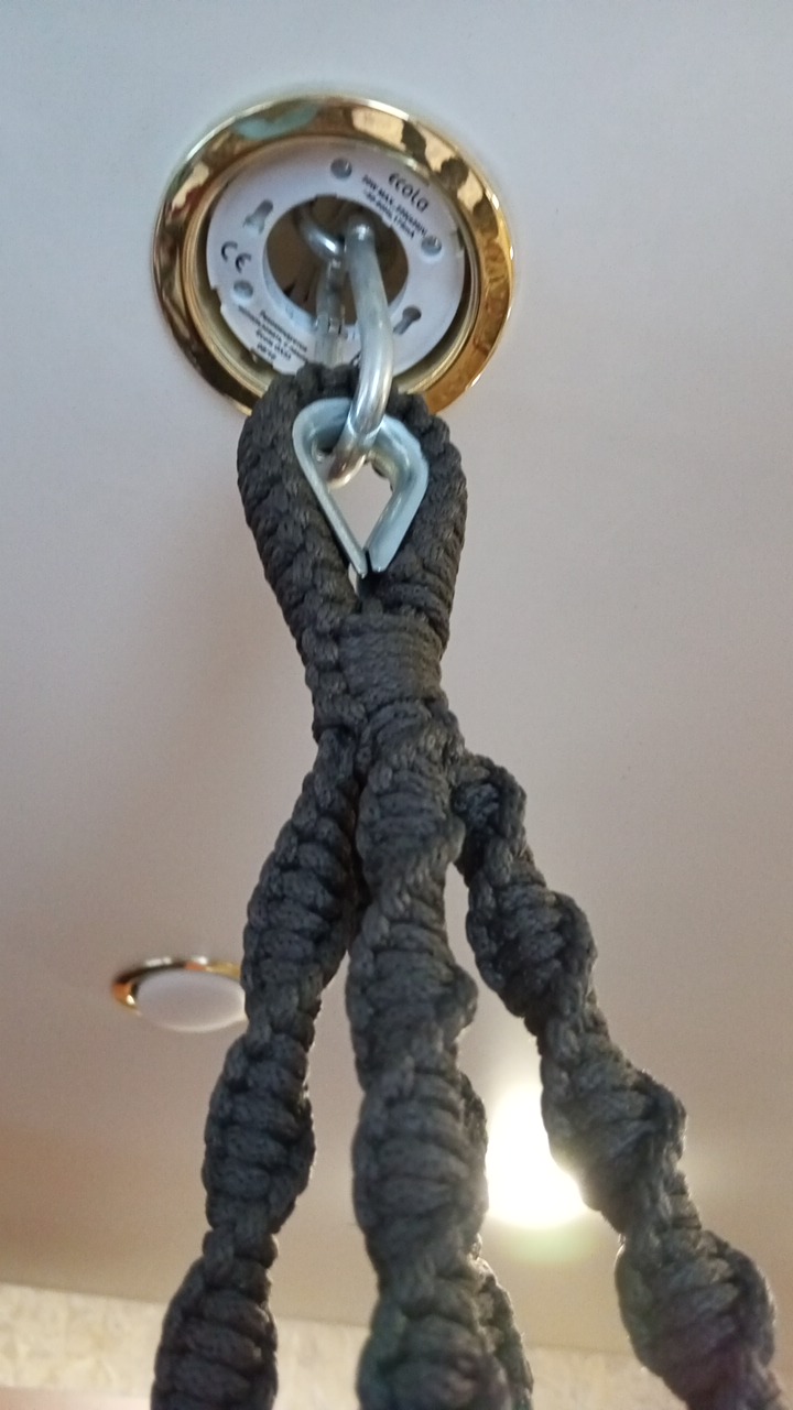 Сделан из прочного гамакового шнура с сердечником и двух кованных колец 80 и 60 см. Оно уже не вытянется , так как подвешан на прочных витых стропах .